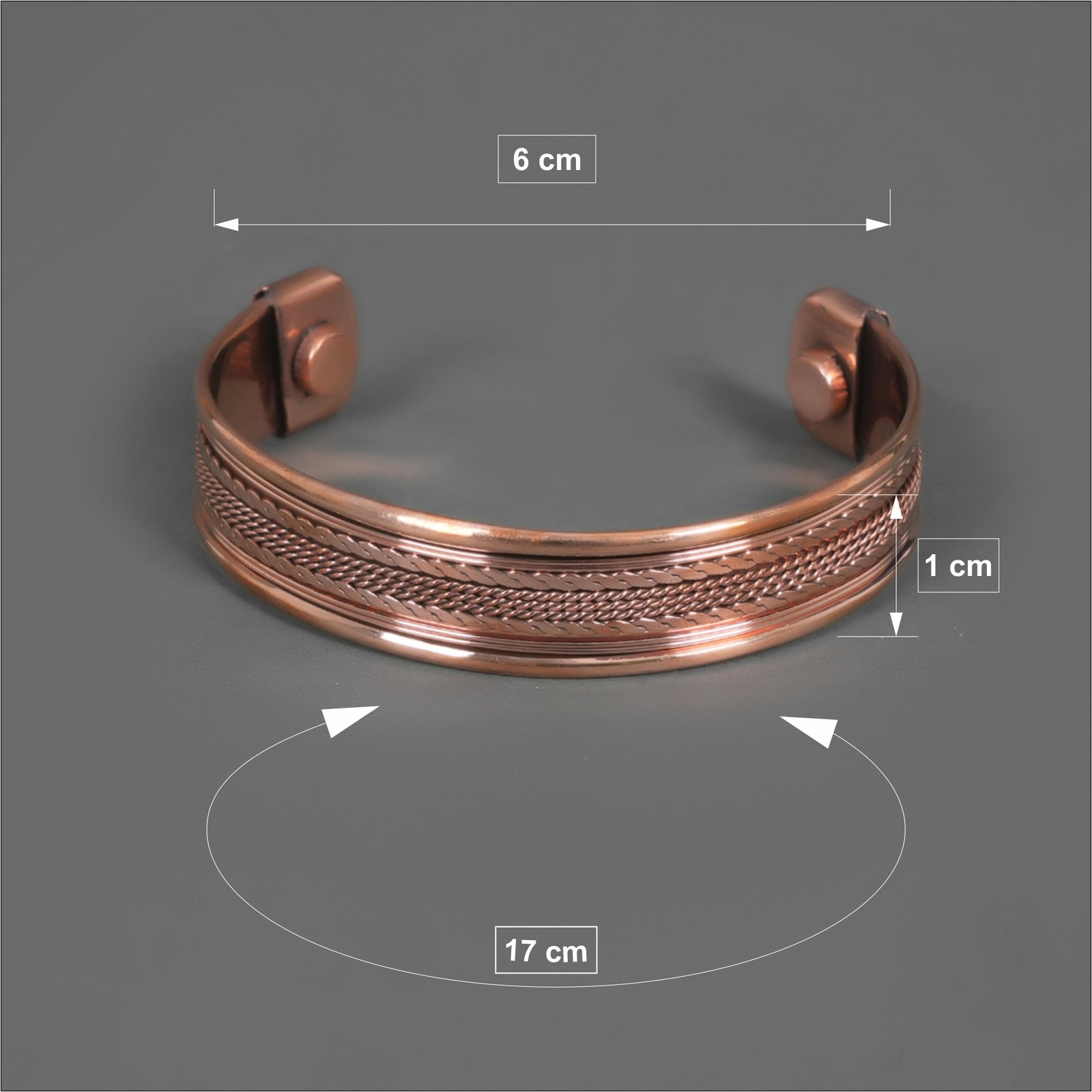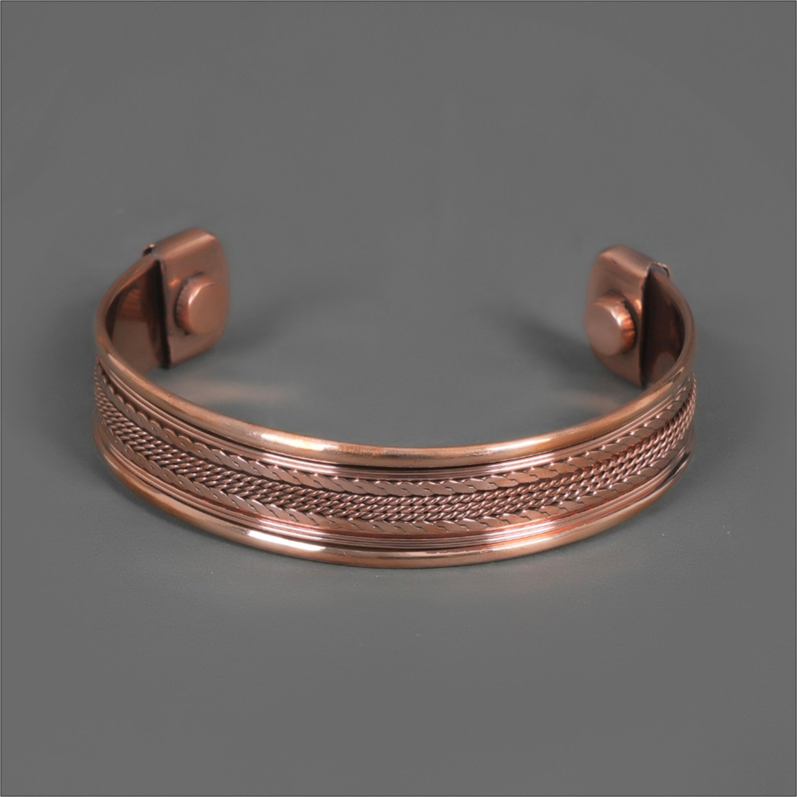 It is made to be worn daily and has magnets on both ends, each with about 1200 Gauss of strength. Copper is absorbed through the skin naturally, while the magnetic fields may help interfere with some of the random effects of modern electric interference, such as laptops, mobile phones, and microwaves.