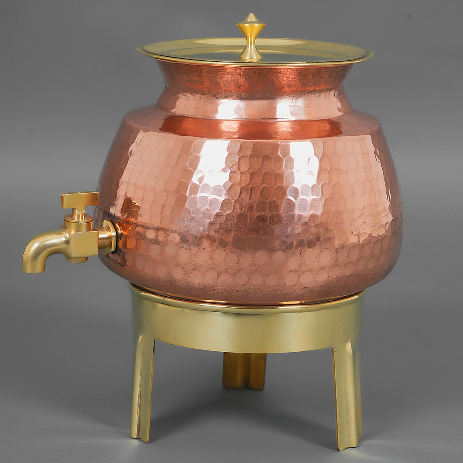 Our dispenser features a sophisticated rounded base, enhancing both its aesthetic appeal and its artisanal craftsmanship. Expertly handcrafted by skilled Thatheras, each unit exhibits refined hammering techniques. The dispenser is equipped with a practical tap, combining functionality with a touch of elegance for a distinguished addition to your home.
