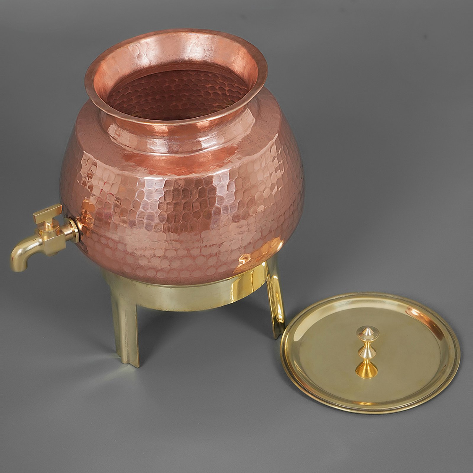 Hand-crafted copper water dispenser, it includes Tap, lid, and Brass stand.